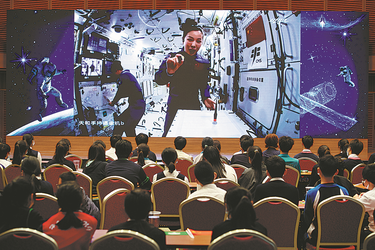 Astronaut Wang Yaping, a member of the Shenzhou XIII crew, delivers a lecture from the Tiangong space station to students in Macao in December. ZHANG JINJIA/XINHUA