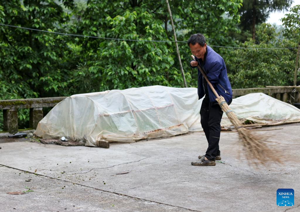 Zhao Youliang cleans the courtyard of his house in Zhongguan Township, Zheng'an County, southwest China's Guizhou Province, May 12, 2022. (Photo by Zhao Yongzhang/Xinhua)