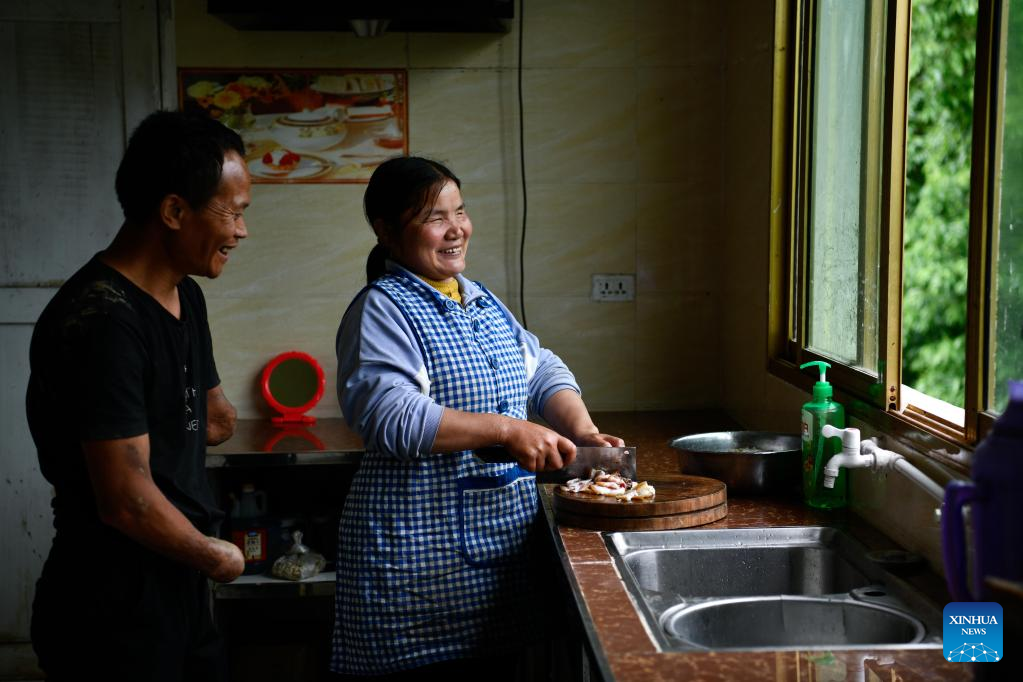 Jian Qin talks to her husband as she prepares to cook at home in Zhongguan Township, Zheng'an County, southwest China's Guizhou Province, May 12, 2022. (Xinhua/Yang Wenbin)