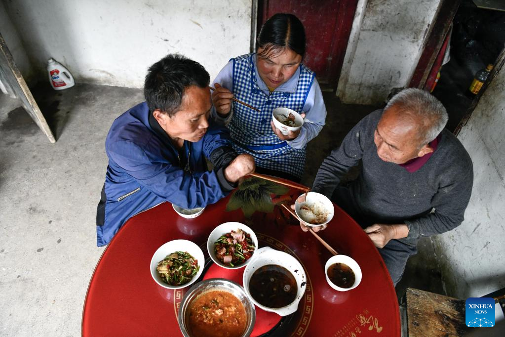 Zhao Youliang (L) picks up food for his father at lunch in Zhongguan Township, Zheng'an County, southwest China's Guizhou Province, May 12, 2022. (Xinhua/Yang Wenbin)