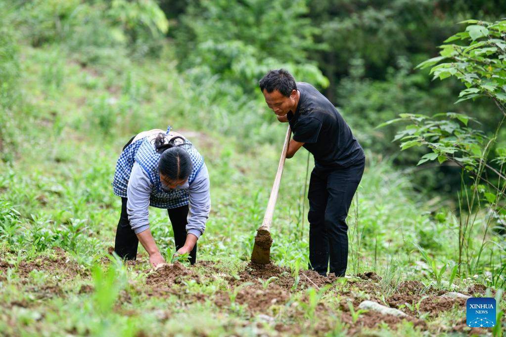 Zhao Youliang (R) and Jian Qin transplant corn seedlings in the field in Zhongguan Township, Zheng'an County, southwest China's Guizhou Province, May 12, 2022. (Xinhua/Yang Wenbin)