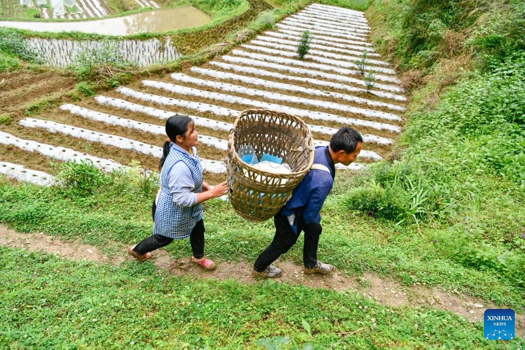 Zhao Youliang (R) with a basket on his back leads Jian Qin back home in Zhongguan Township, Zheng'an County, southwest China's Guizhou Province, May 12, 2022. (Xinhua/Yang Wenbin)