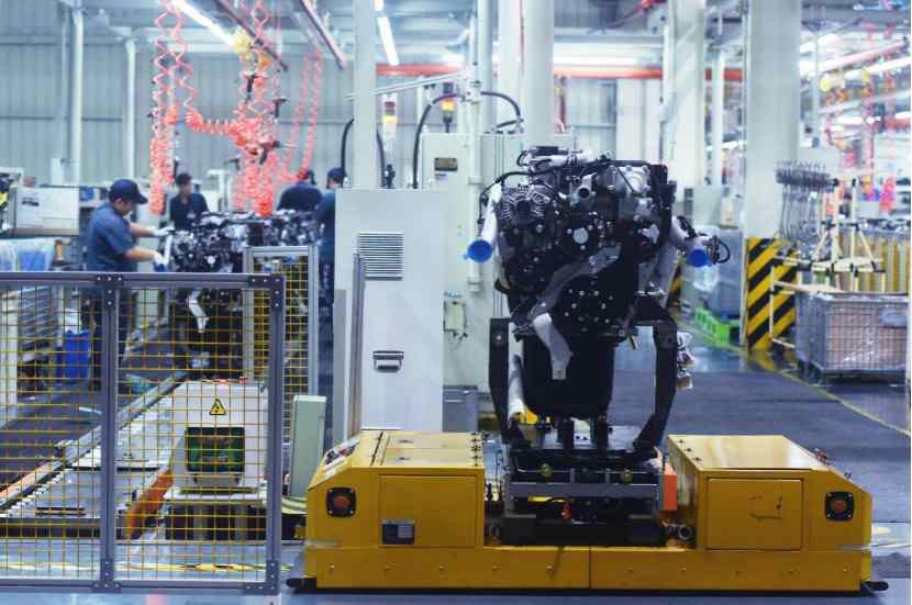 An AI-powered robot carries a heavy truck engine at a factory of SINOTRUK Hangzhou Engine Co., Ltd. located in a robot manufacturing base in Xiaoshan Economic and Technological Development Zone, Hangzhou city, east China’s Zhejiang province, Oct. 18, 2021. (People's Daily Online/Long Wei)