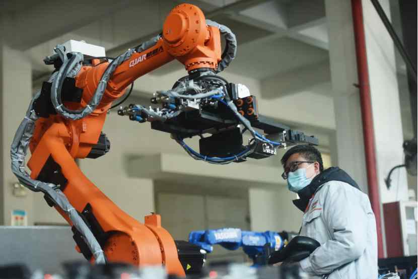 An engineer with Zhejiang Qianjiang Robot Co., Ltd. tests an industrial robot before it rolls off the production line at a workshop of the company located in a robot manufacturing base in Xiaoshan Economic and Technological Development Zone, Hangzhou city, east China’s Zhejiang province, Jan. 17, 2022. (People’s Daily Online/Long Wei)