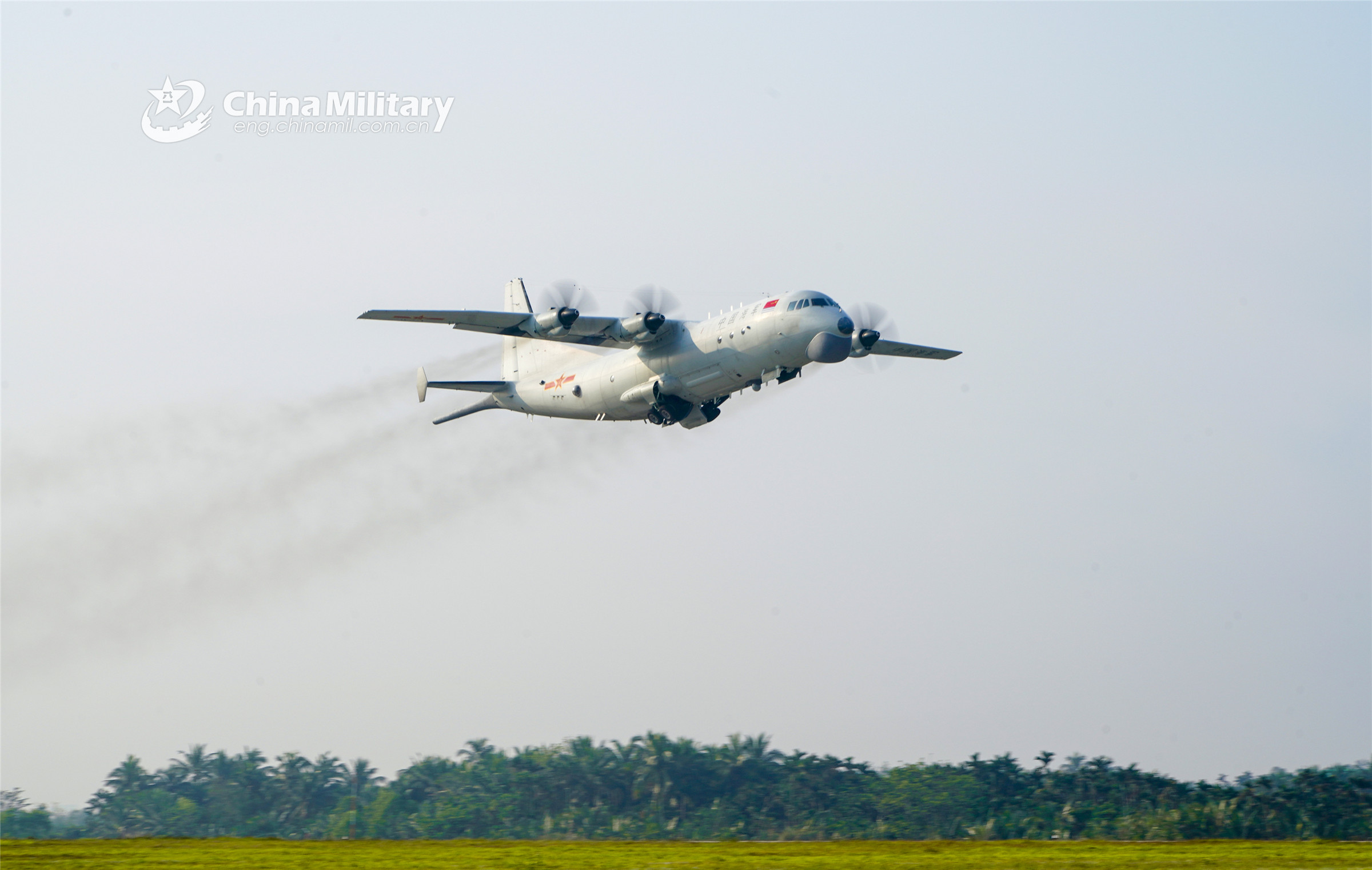 An anti-submarine patrol aircraft attached to a naval aviation regiment under the PLA Southern Theater Command spins its propellers before takeoff for a maritime patrol and anti-submarine training exercise on February 16, 2022. (eng.chinamil.com.cn/Photo by Qin Qianjiang)