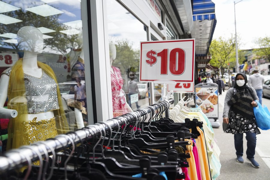 A woman walks past a store in New York, the United States, May 11, 2022. U.S. consumer inflation in April surged by 8.3 percent from a year ago. (Xinhua/Wang Ying)