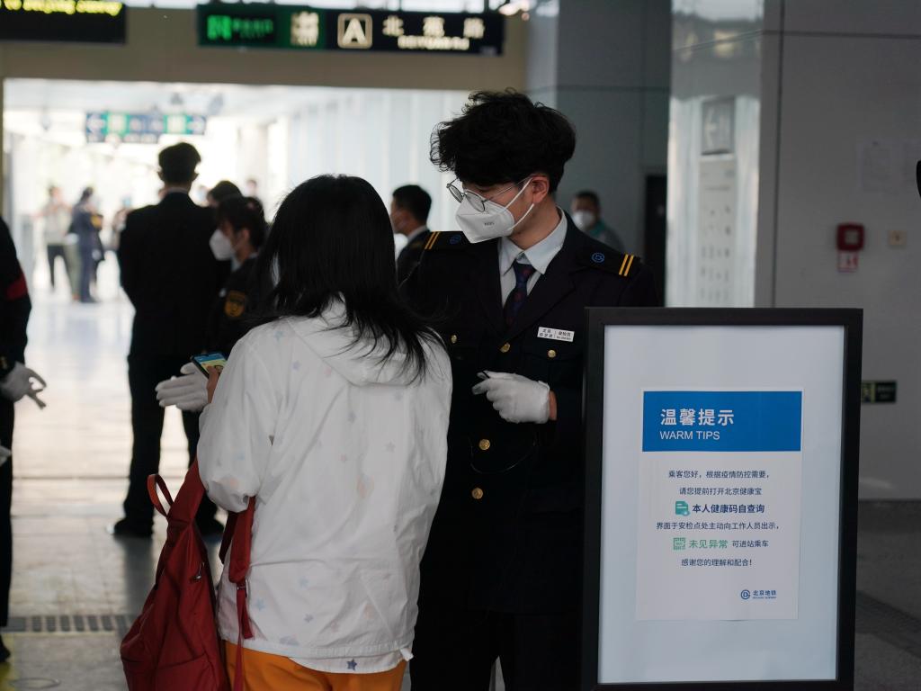 Passengers are required from Tuesday to have their health QR codes checked before taking public transport at some bus stops and subway stations near restrictive control areas and closed-off management areas in Beijing. (Xinhua/Zhang Chenlin)
