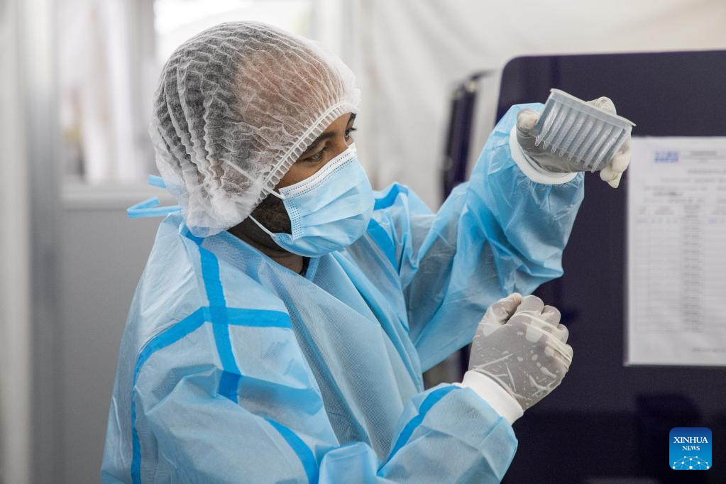 Photo taken on May 4, 2022 shows Kominist Asmamaw, a biological laboratory engineer at BGI Health Ethiopia, working in the inflatable COVID-19 testing lab Huo-Yan Air Lab at the Addis Ababa Bole International Airport, Ethiopia. BGI Health Ethiopia, a subsidiary of China's biotech giant, the BGI Genomics Co., Ltd., has won acclaim for its technology and knowledge transfer endeavors to propel Ethiopia's fight against the COVID-19 pandemic. (Xinhua/Michael Tewelde)