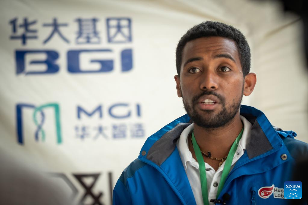 Photo taken on May 4, 2022 shows Eyuel Fikru, a local team coordinator at the inflatable COVID-19 testing lab Huo-Yan Air Lab, speaking during an interview at Huo-Yan Air Lab at the Addis Ababa Bole International Airport, Ethiopia. BGI Health Ethiopia, a subsidiary of China's biotech giant, the BGI Genomics Co., Ltd., has won acclaim for its technology and knowledge transfer endeavors to propel Ethiopia's fight against the COVID-19 pandemic. (Xinhua/Michael Tewelde)
