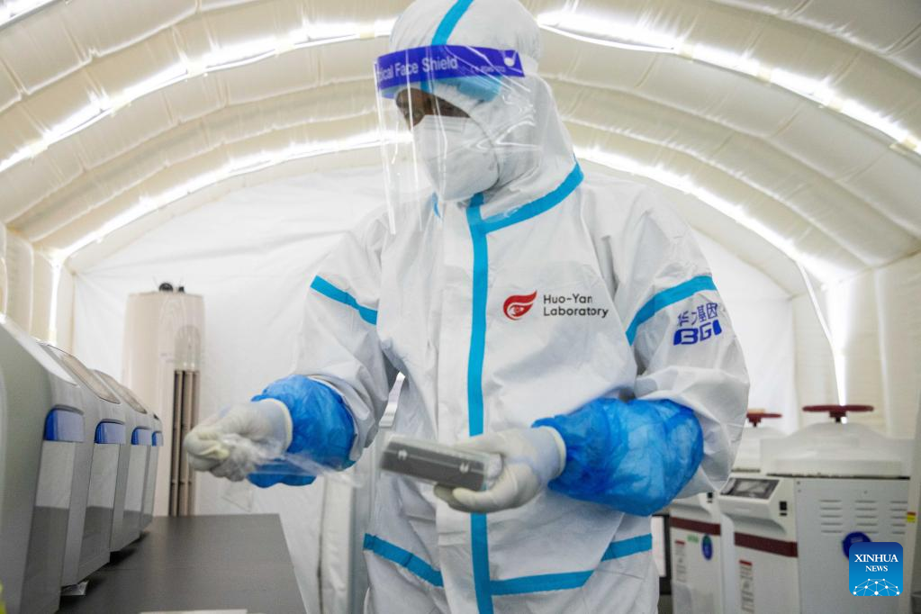 Photo taken on May 4, 2022 shows Kominist Asmamaw, a biological laboratory engineer at BGI Health Ethiopia, working in the inflatable COVID-19 testing lab Huo-Yan Air Lab at the Addis Ababa Bole International Airport, Ethiopia. BGI Health Ethiopia, a subsidiary of China's biotech giant, the BGI Genomics Co., Ltd., has won acclaim for its technology and knowledge transfer endeavors to propel Ethiopia's fight against the COVID-19 pandemic. (Xinhua/Michael Tewelde)