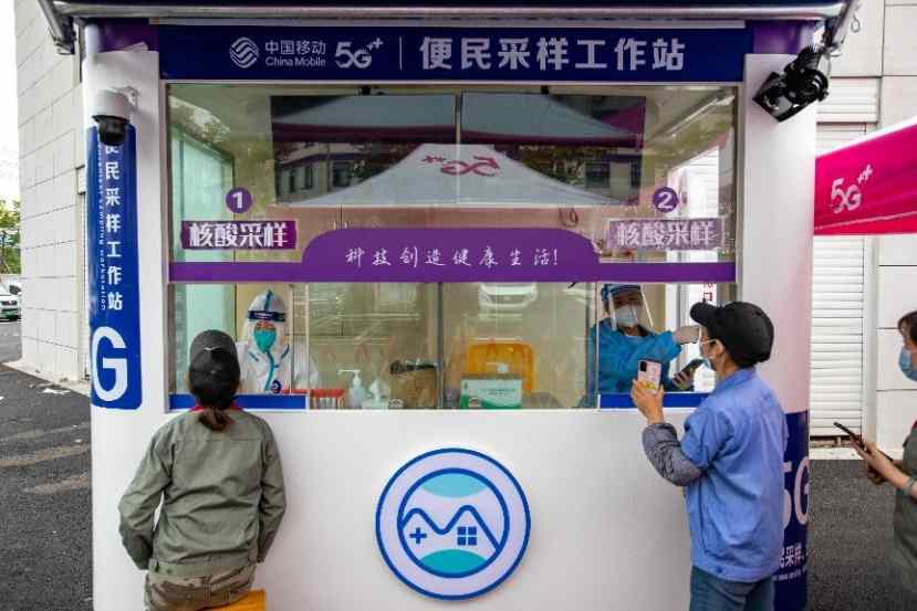 Medical workers collect throat swab samples for COVID-19 nucleic acid tests from staff members of a new energy vehicle company based in Jiangdong township, Jindong district, Jinhua city, east China’s Zhejiang province, May 16, 2022. (People’s Daily Online/Yang Meiqing)