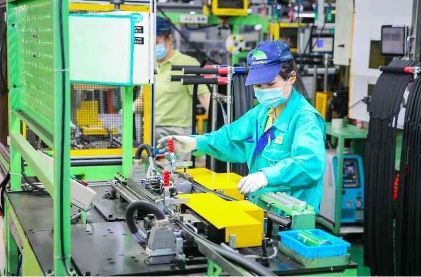 Photo taken on May 15, 2022, shows busy workers in the manufacturing shop of a company based in Songjiang district, east China’s Shanghai. (People’s Daily Online/Cai Bin)