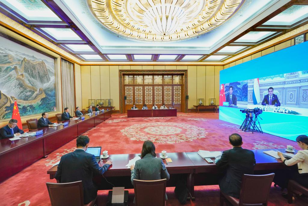 Li Zhanshu, chairman of the National People's Congress (NPC) Standing Committee, holds talks with Rustam Emomali, chairman of the National Assembly of Tajikistan, via video link in Beijing, capital of China, on May 17, 2022. (Xinhua/Gao Jie)