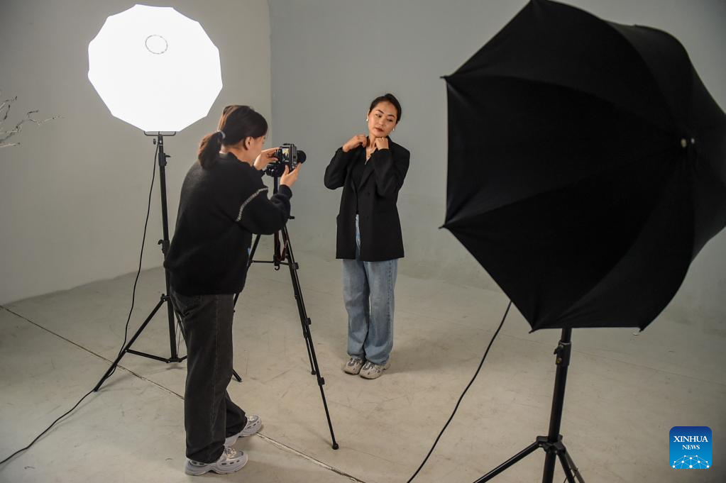 Zhang Aoyu (L) takes photos for Tergel with silver accessory products at their workshop in Xilinhot of Xilingol League, north China's Inner Mongolia Autonomous Region, May 16, 2022.