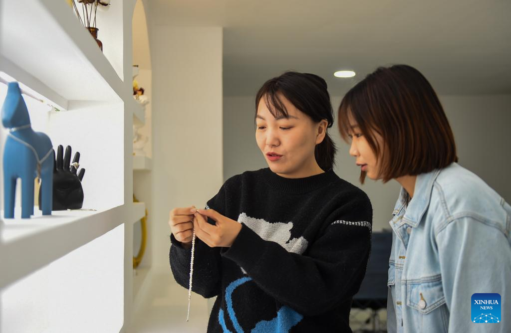 After graduation, Tergel and Zhang Aoyu chose to start up their own business, which has integrated fashionable elements into traditional silver accessory making. They sell their silver accessory products both online and offline, including the popular live-streaming sales, to have their products publicized and attract more young customers to be fascinated by their traditional silver accessories with modern elements. (Xinhua/Peng Yuan)