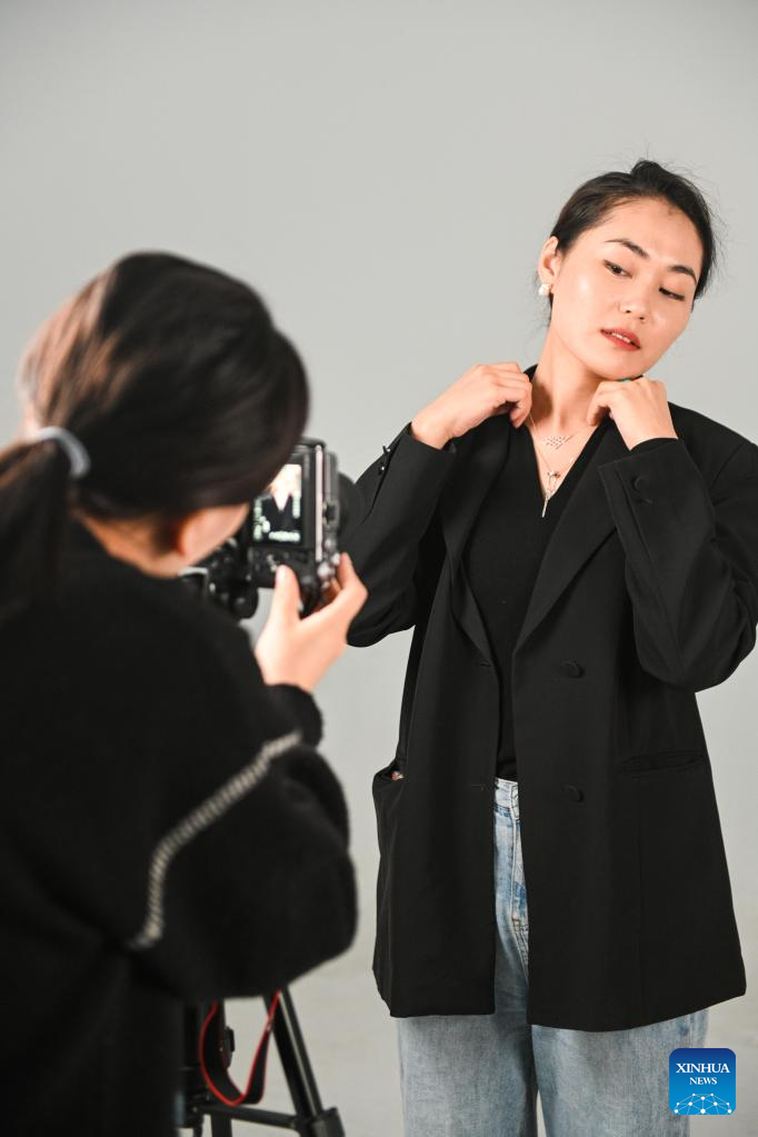 Zhang Aoyu (L) takes photos for Tergel with silver accessory products at their workshop in Xilinhot of Xilingol League, north China's Inner Mongolia Autonomous Region, May 16, 2022.