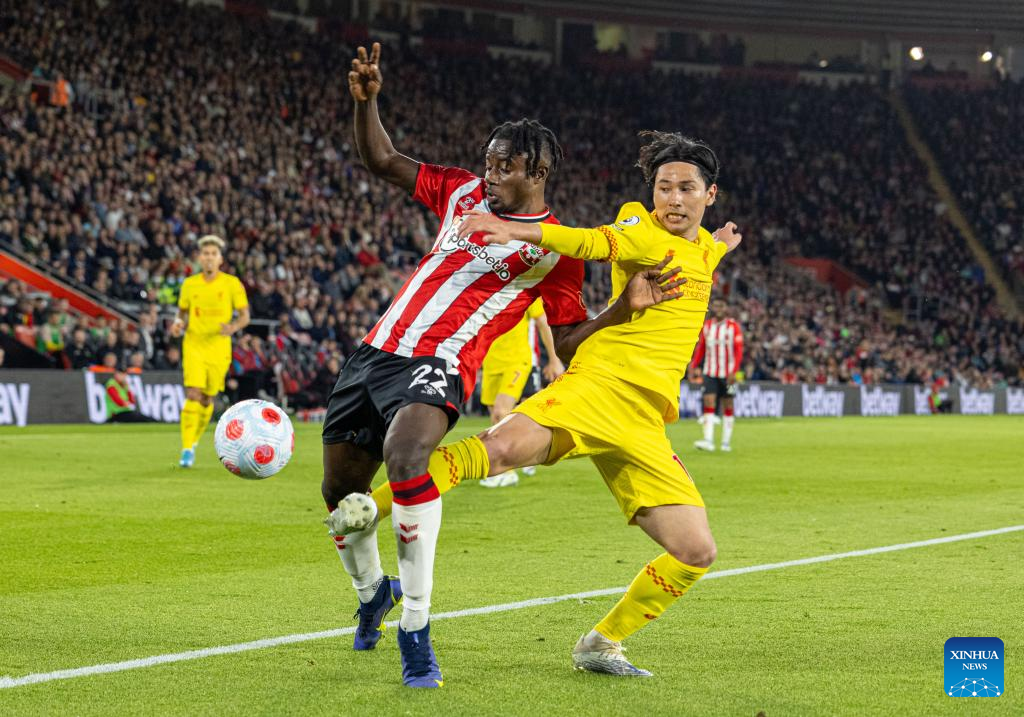 Liverpool's Takumi Minamino (R) challenges Southampton's Mohammed Salisu during the English Premier League match between Southampton and Liverpool in Southampton, Britain, on May 17, 2022. (Xinhua)