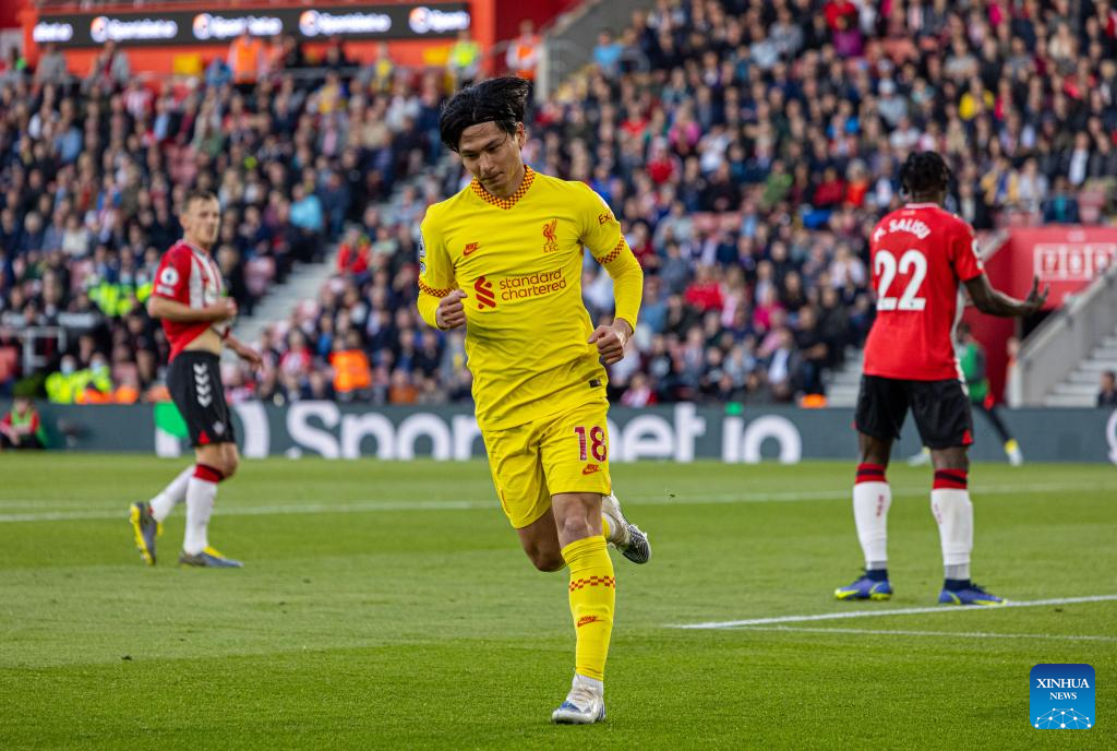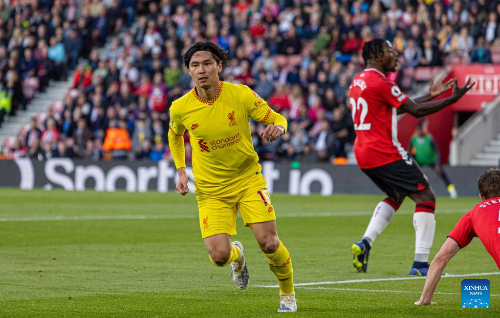 Liverpool's Takumi Minamino celebrates after scoring the equalising goal during the English Premier League match between Southampton and Liverpool in Southampton, Britain, on May 17, 2022. (Xinhua)