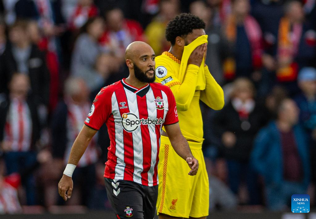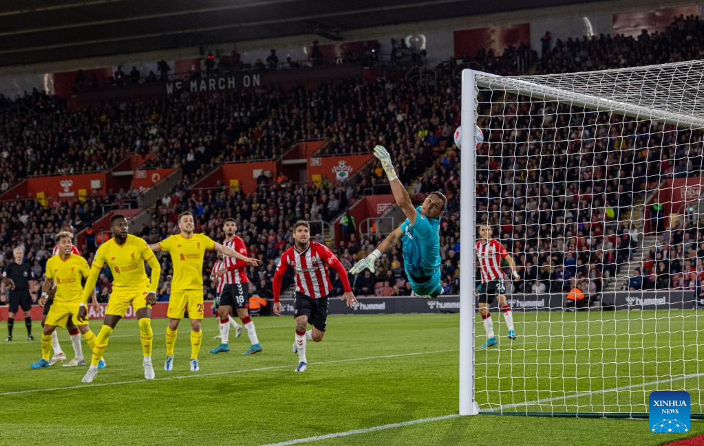 Southampton's goalkeeper Alex McCarthy (Top) is beaten as Liverpool score the winning second goal during the English Premier League match between Southampton and Liverpool in Southampton, Britain, on May 17, 2022. (Xinhua)