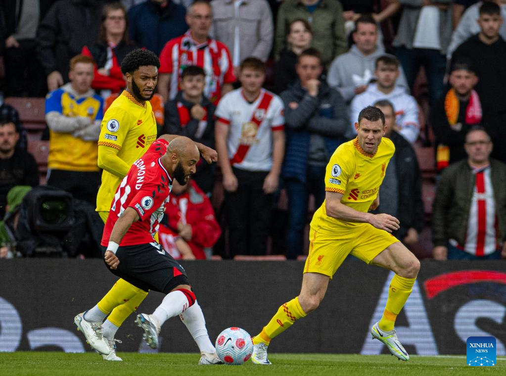 Southampton's Nathan Redmond (C) controls the ball during the English Premier League match between Southampton and Liverpool in Southampton, Britain, on May 17, 2022. (Xinhua)