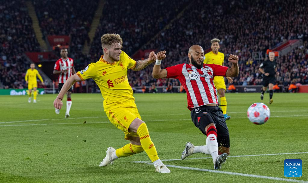 Liverpool's Harvey Elliott (L) shoots during the English Premier League match between Southampton and Liverpool in Southampton, Britain, on May 17, 2022. (Xinhua)
