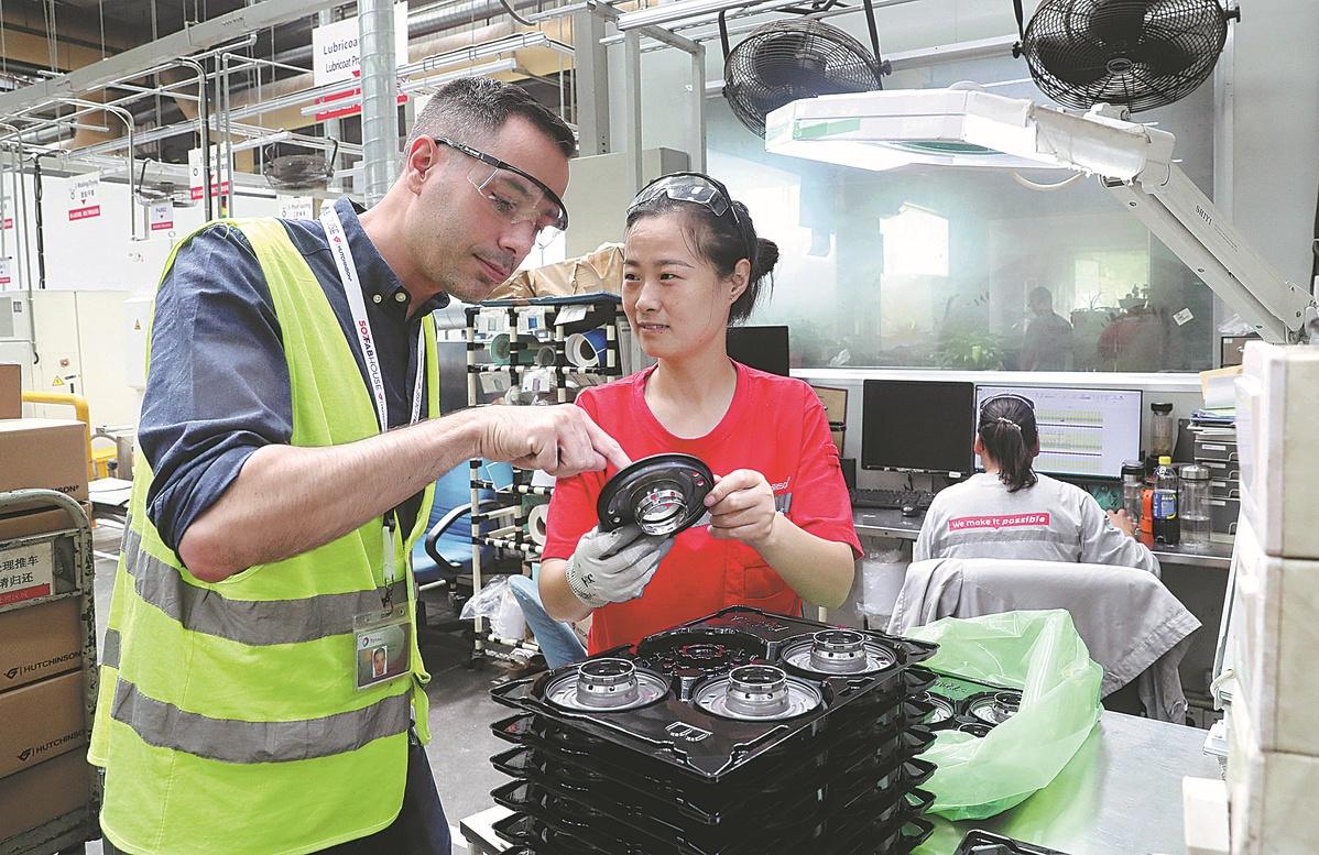 Technicians discuss products at a joint venture in Suzhou, Jiangsu province. (HUA XUEGEN/FOR CHINA DAILY)