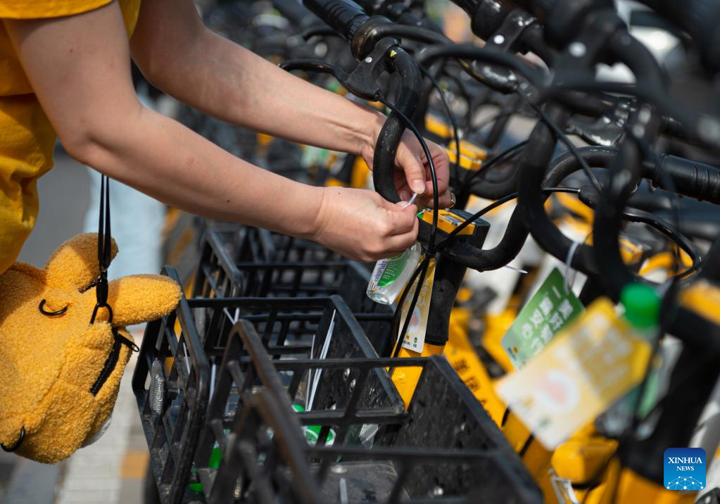 In Beijing, shared bikes have been disinfected and some of them are equipped with hand sanitizers recently as COVID-19 precaution measures, for the sake of the riders' health amid the recent COVID-19 resurgence. (Xinhua/Chen Zhonghao)