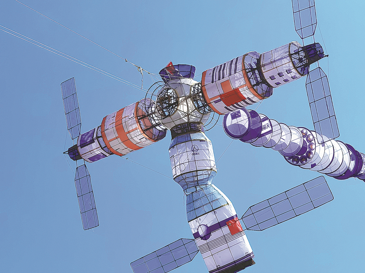 A kite in the shape of China's Tiangong space station is flown in April in Weifang, Shandong province, to celebrate the successful return of the three astronauts of the Shenzhou XIII mission. LIU XIAOXI/FOR CHINA DAILY