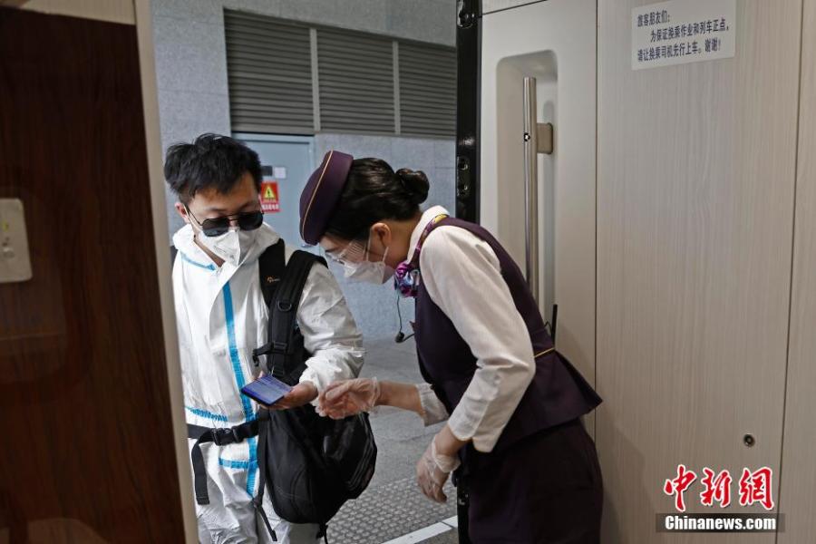 A train stewardess checks a passenger's ticket at Shanghai railway station, east China's Shanghai, May, 18, 2022. (Photo: China News Service/Yin Liqin)