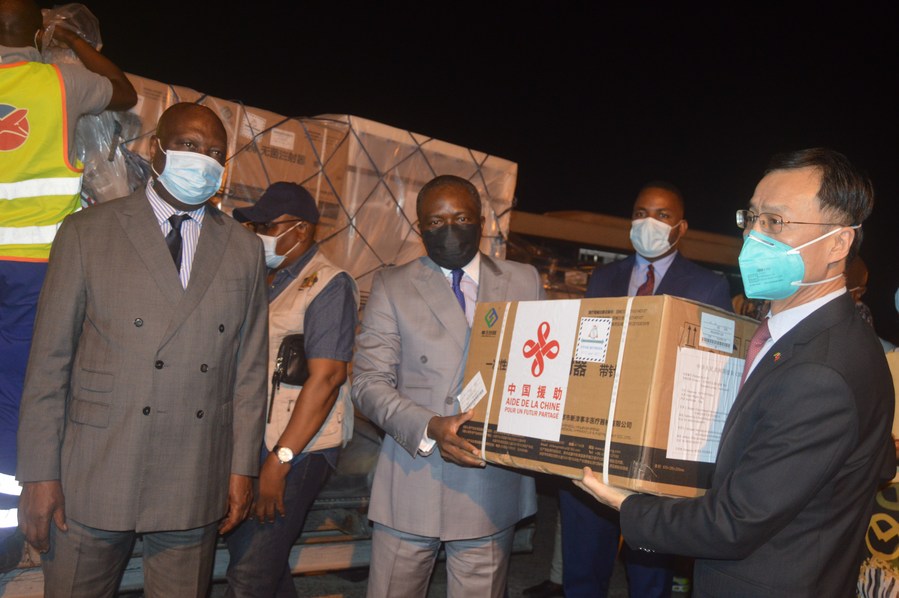Chinese ambassador to the Republic of the Congo Ma Fulin (1st R) hands over a box of COVID-19 vaccine to Congolese official at Maya-Maya airport in Brazzaville, Republic of the Congo, Jan. 20, 2022. (Xinhua)
