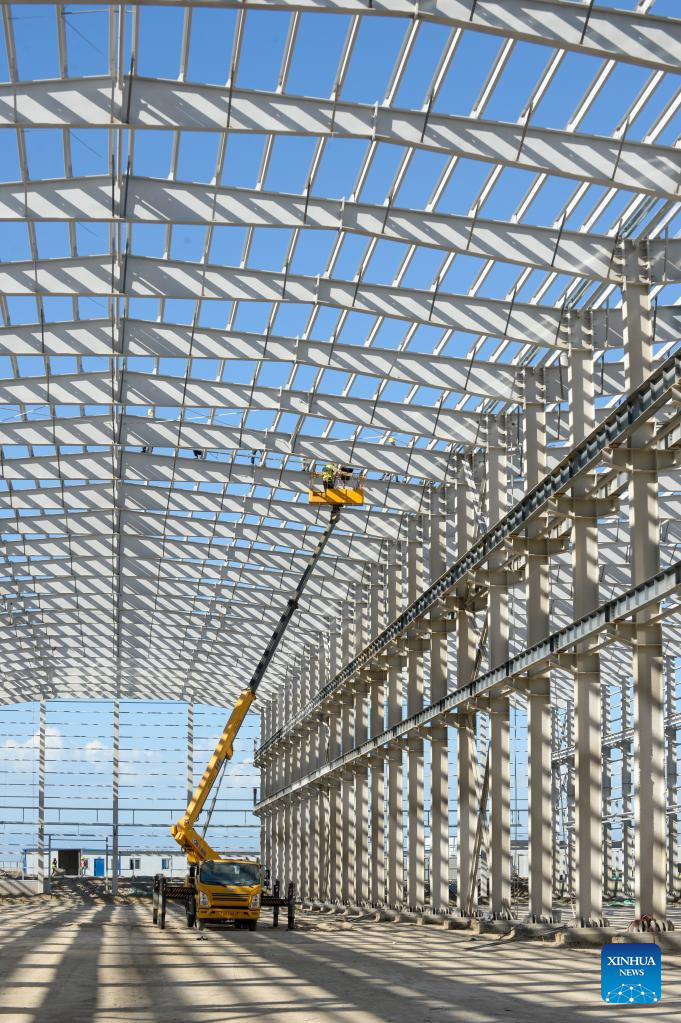 A worker works at a construction site in Tacheng, northwest China's Xinjiang Uygur Autonomous Region, May 18, 2022. Construction workers are busy building major infrastructure projects in the key pilot zone of Tacheng, northwest China's Xinjiang Uygur Autonomous Region. (Xinhua/Gao Han)