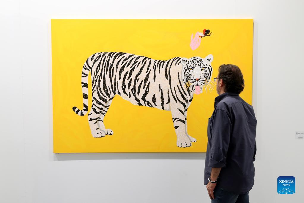 A visitor looks at an art piece at the ARCOlisboa international contemporary art fair in Lisbon, Portugal, on May 19, 2022. The ARCOlisboa 2022 which kicked off on Thursday, will last till May 22. (Photo by Pedro Fiuza/Xinhua)