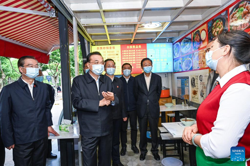 Chinese Premier Li Keqiang, also a member of the Standing Committee of the Political Bureau of the Communist Party of China Central Committee, visits a snack bar in Kunming, southwest China's Yunnan, May 19, 2022. Li made an inspection tour in Qujing and Kunming of southwest China's Yunnan Province from Tuesday to Thursday. (Xinhua/Rao Aimin)