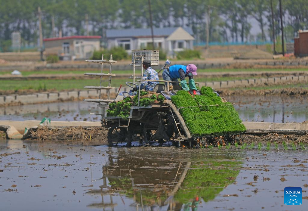Farmers transplant rice seedlings in a field in Shenbei New District of Shenyang, northeast China's Liaoning Province, May 18, 2022. Liaoning has stepped up efforts on farming activities as the temperature rises recently. By May 17, the province's spring sowing area of crops has reached 48,645,000 mu (3,243,000 hectares). (Xinhua/Yang Qing)