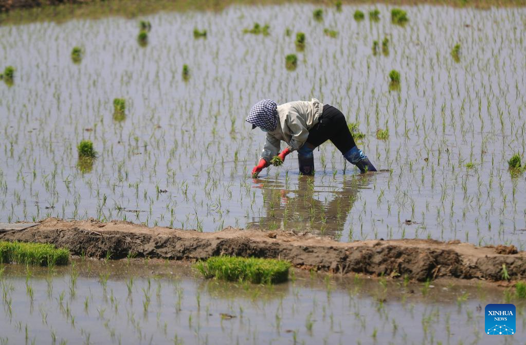 A farmer transplants rice seedlings in a field in Shenbei New District of Shenyang, northeast China's Liaoning Province, May 18, 2022. Liaoning has stepped up efforts on farming activities as the temperature rises recently. By May 17, the province's spring sowing area of crops has reached 48,645,000 mu (3,243,000 hectares). (Xinhua/Yang Qing)