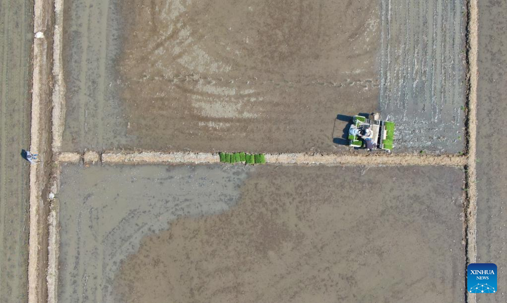Aerial photo taken on May 18, 2022 shows farmers transplanting rice seedlings in a field in Shenbei New District of Shenyang, northeast China's Liaoning Province. Liaoning has stepped up efforts on farming activities as the temperature rises recently. By May 17, the province's spring sowing area of crops has reached 48,645,000 mu (3,243,000 hectares). (Xinhua/Yang Qing)