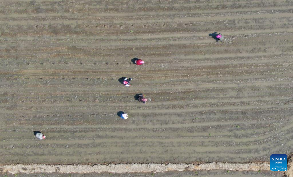 Aerial photo taken on May 18, 2022 shows farmers transplanting rice seedlings in a field in Shenbei New District of Shenyang, northeast China's Liaoning Province. Liaoning has stepped up efforts on farming activities as the temperature rises recently. By May 17, the province's spring sowing area of crops has reached 48,645,000 mu (3,243,000 hectares). (Xinhua/Yang Qing)