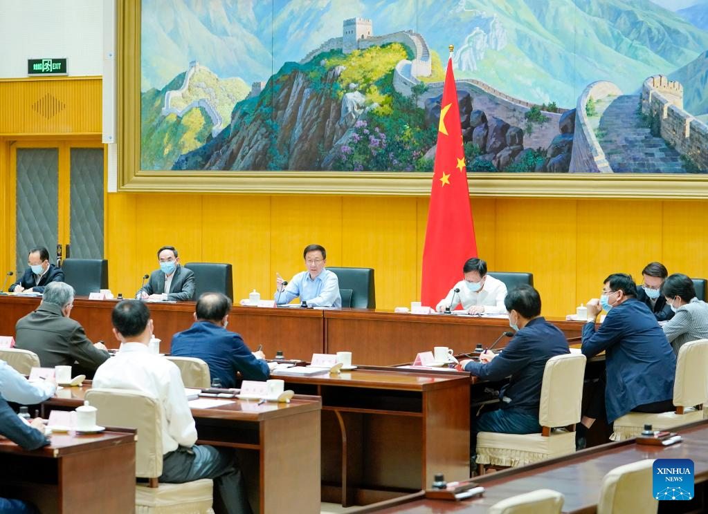 Chinese Vice Premier Han Zheng, also a member of the Standing Committee of the Political Bureau of the Communist Party of China Central Committee, presides over a meeting of the leading group of central inspection on ecological and environmental protection in Beijing, capital of China, May 19, 2022. (Xinhua/Gao Jie)
