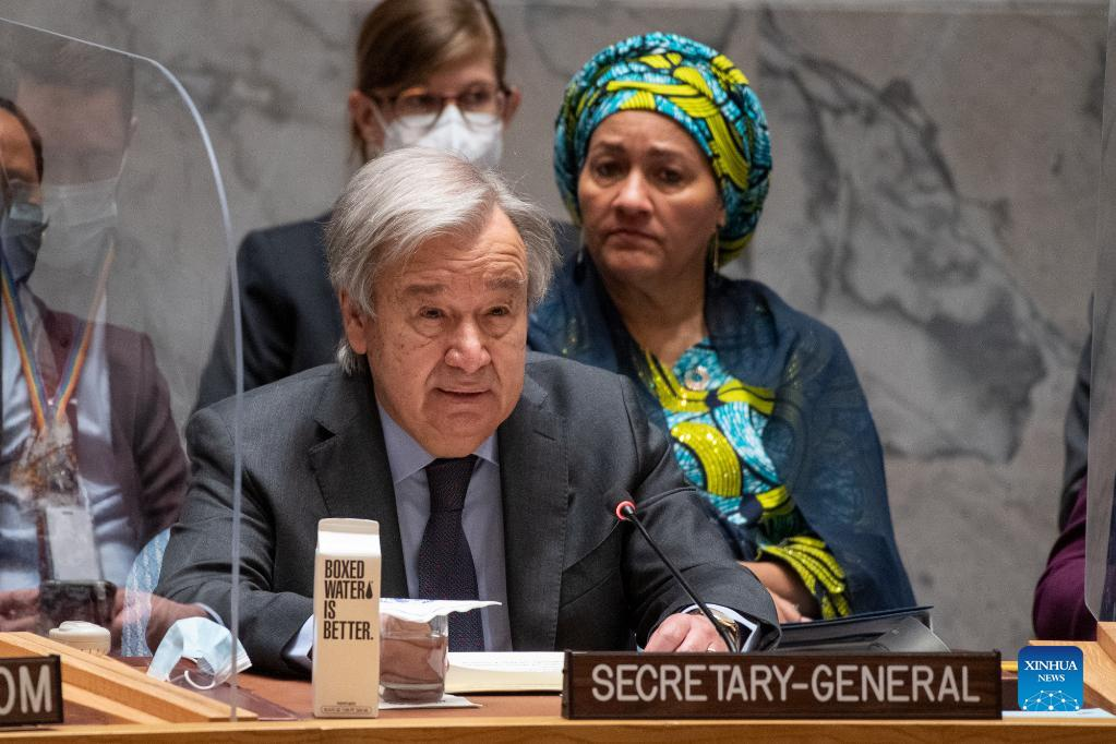 UN Secretary-General Antonio Guterres addresses the Security Council meeting on conflict and food security at the UN headquarters in New York, May 19, 2022. The UN Security Council met on Thursday to address food insecurity and called on the international community to strengthen cooperation to solve it. (Eskinder Debebe/UN Photo/Handout via Xinhua)