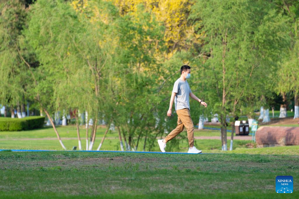 A man takes a walk at a park in Xiangfang District of Harbin, northeast China's Heilongjiang Province, May 19, 2022. Normal life in Harbin has gradually resumed as the latest COVID-19 resurgence waned. (Xinhua/Xie Jianfei)
