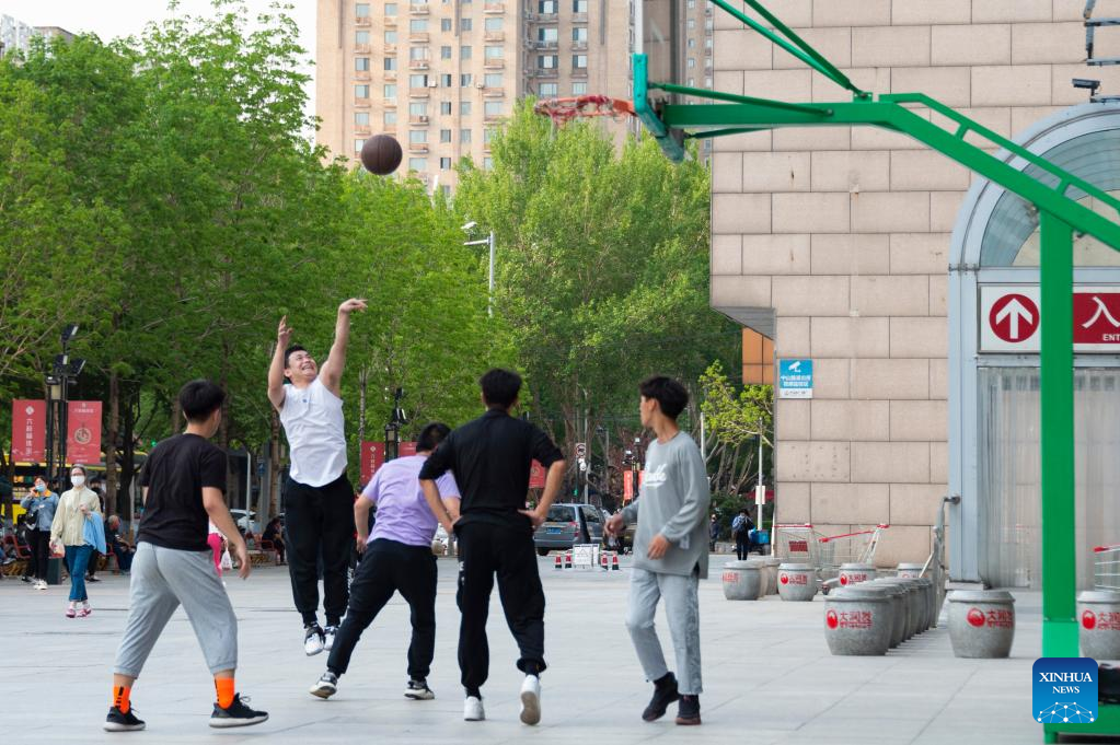 People play basketball outside a shopping mall in Xiangfang District of Harbin, northeast China's Heilongjiang Province, May 19, 2022. Normal life in Harbin has gradually resumed as the latest COVID-19 resurgence waned. (Xinhua/Xie Jianfei)