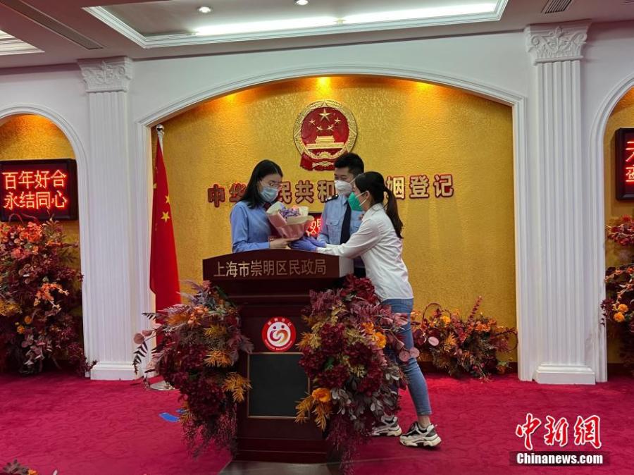 A staff member presents a bunch of flowers and epidemic prevention products to the newlyweds at a marriage registration center in Chaoming district, east China's Shanghai, May 20, 2022. (Photo: China News Service/Yang Yichen)