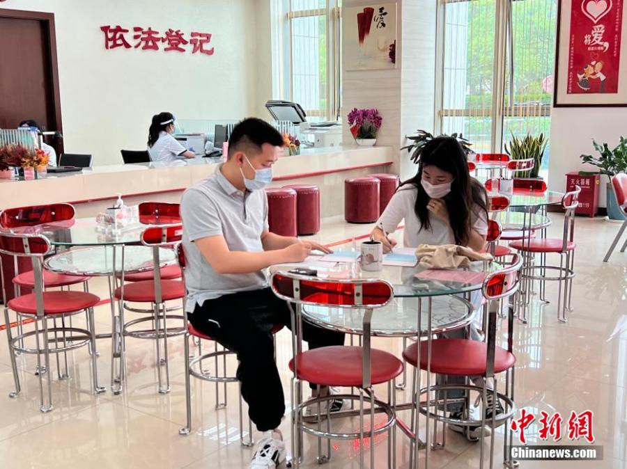 A couple registers at a marriage registration center in Chaoming district, east China's Shanghai, May 20, 2022. Shanghai's Chongming district will resume marriage registration services from May 23. (Photo: China News Service/Yang Yichen)