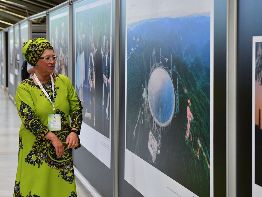 A visitor views photos during the third edition of the BRICS Media Joint Photo Exhibition in Sao Paulo, Brazil, Oct. 30, 2019. (Xinhua/Xin Yuewei)