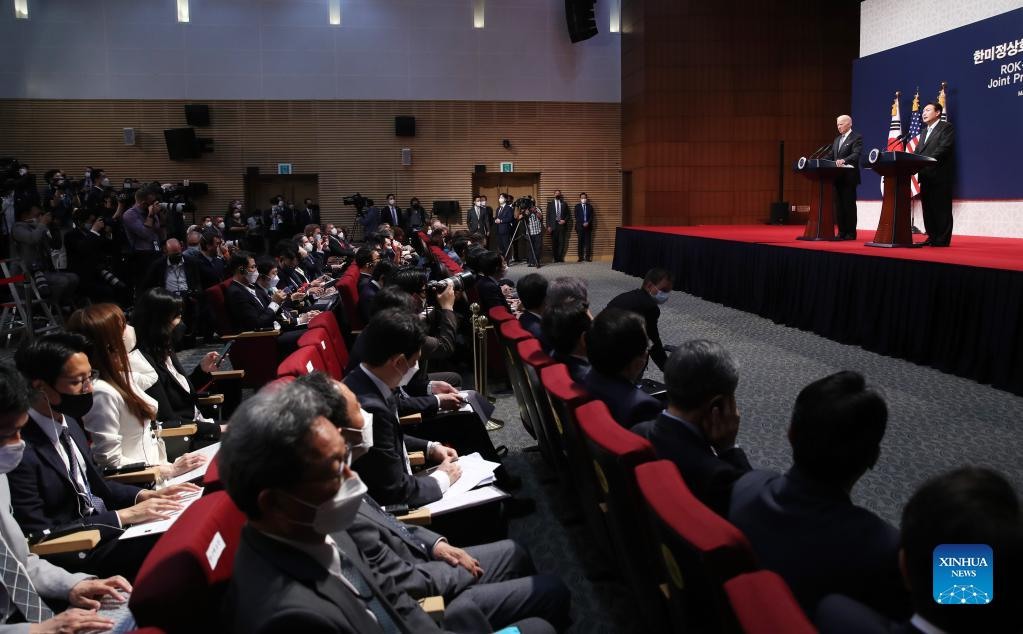 South Korean President Yoon Suk-yeol and U.S. President Joe Biden attend a joint press conference in Seoul, South Korea, May 21, 2022. The two presidents on Saturday held their first summit talks in Seoul. (NEWSIS/Handout via Xinhua)