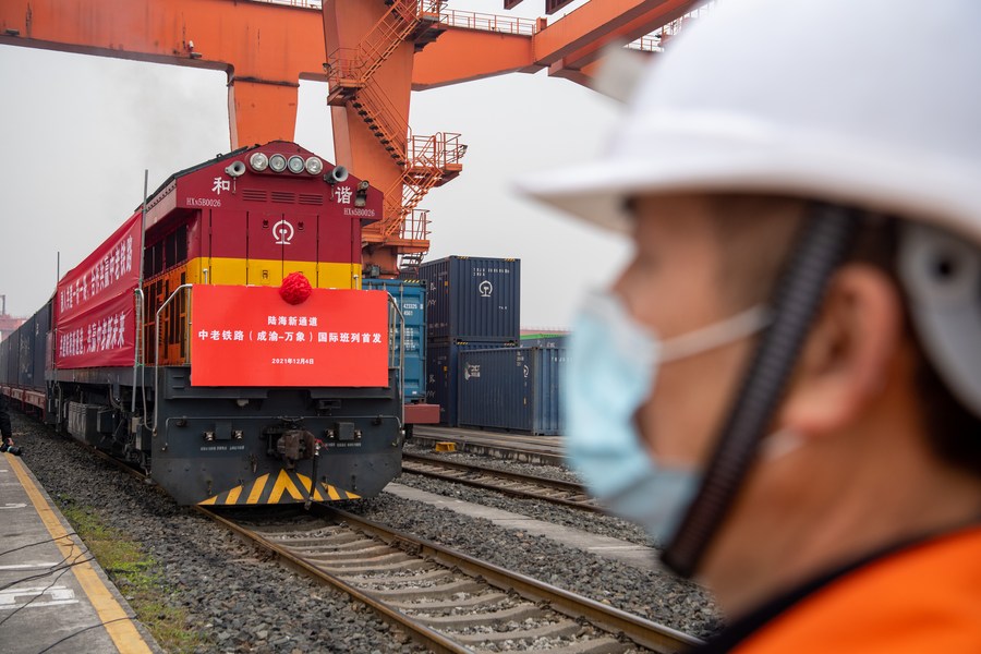 A freight train bound for Lao capital Vientiane is about to set off from southwest China's Chongqing, Dec. 4, 2021. (Xinhua/Tang Yi)