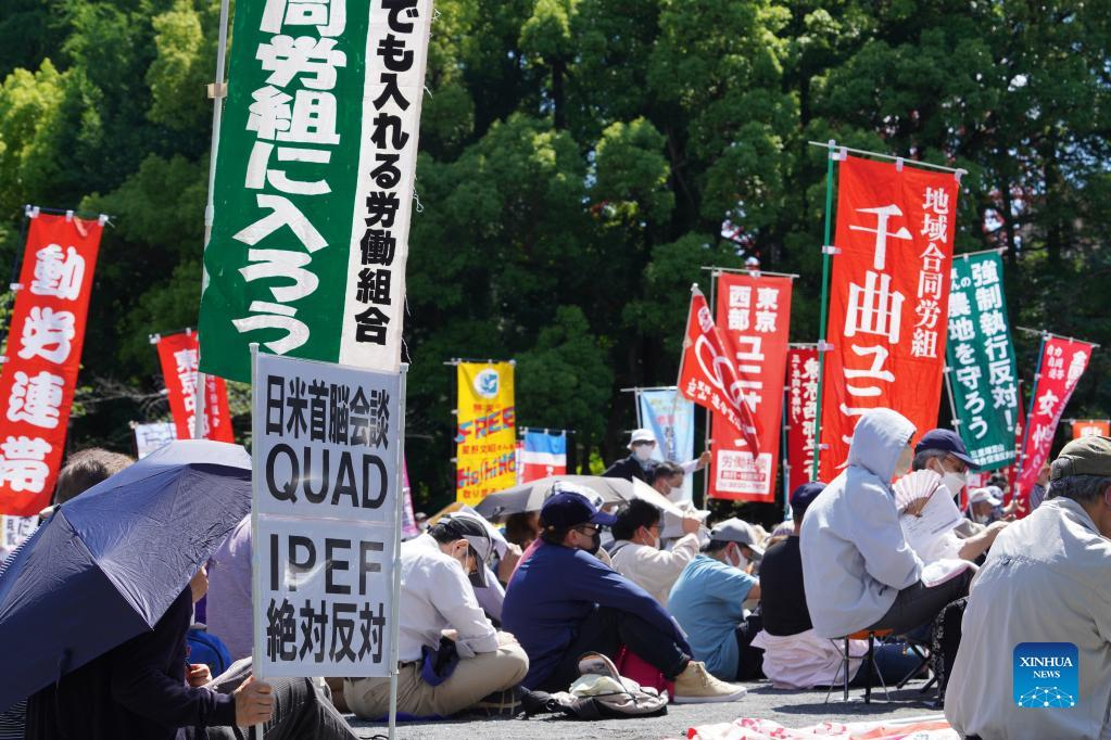 Protesters gather at Shiba Park in Tokyo, Japan, May 22, 2022. U.S. President Joe Biden arrived in Japan on Sunday, as about 750 protesters took to the streets here against the planned U.S.-Japan summit and the summit of the Quadrilateral Security Dialogue (the Quad). (Xinhua/Zhang Xiaoyu)