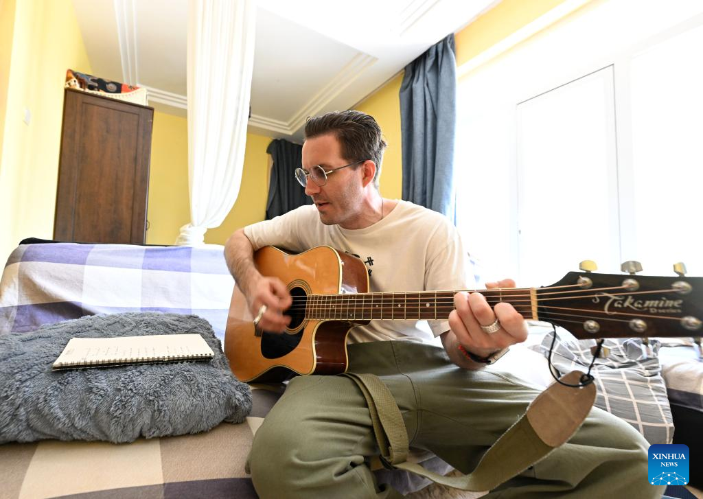 Iarroumets Jonathan plays the guitar at home after volunteer work at a community in Nankai District, north China's Tianjin, May 22, 2022.
