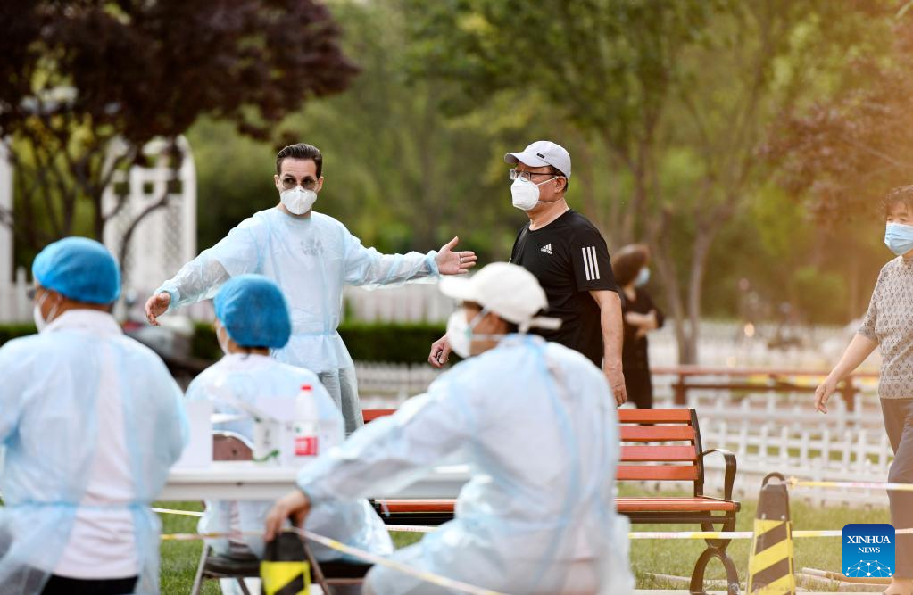 Iarroumets Jonathan guides residents to receive nucleic acid tests at a community in Nankai District, north China's Tianjin, May 22, 2022.