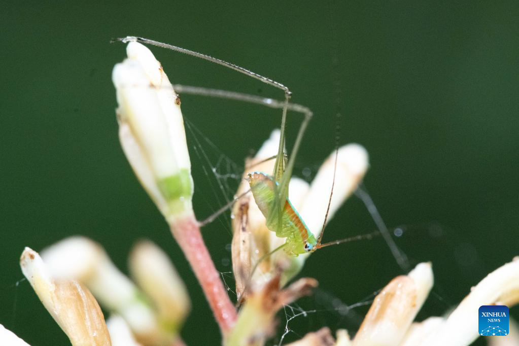 A long-horned grasshopper is seen in the Wuzhishan section of the Hainan Tropical Rainforest National Park in south China's Hainan Province, May 17, 2022. Wuzhishan section is a core part of the Hainan Tropical Rainforest National Park. The national park, covering 4,269 square km, is home to the most concentrated and well-preserved tropical rainforests in China. (Xinhua/Hu Zhixuan)